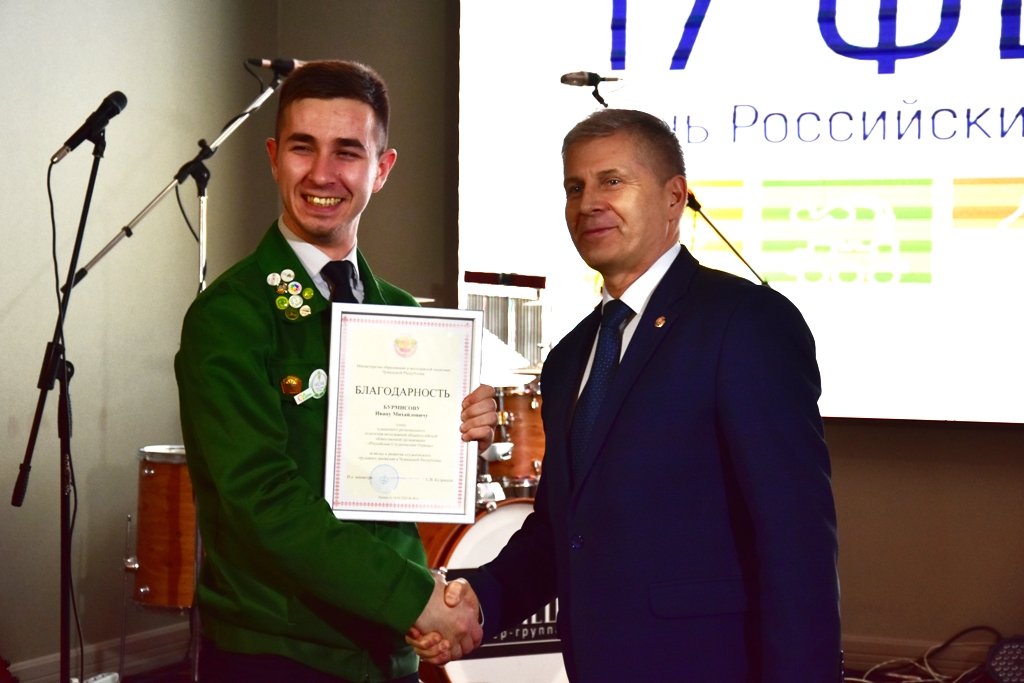 Поздравить студотрядовцев пришли депутат Государственной Думы Российской Федерации VII созыва Леонид Черкесов, и.о. министра образования и молодежной политики Чувашской Республики Сергей Кудряшов, директор Центра молодежных инициатив Юлия Аланова. Леонид Ильич вспомнил свои студенческие годы в составе медицинского отряда «Вита», поздравил всех с праздником и вручил Благодарственные письма бойцам за активную жизненную позицию, неиссякаемую энергию и оптимизм, личный вклад в развитие движения «Российские Студенческие Отряды». За активную работу по развитию студенческих трудовых отрядов в академии Благодарственное письмо вручили командиру Штаба СТО Чувашской ГСХА Екатерине Григорьевой. Благодарности за вклад в развитие студенческого трудового движения в Чувашской Республике удостоились методист студенческого ветеринарного отряда «Зверополис» Кристина Хуморова и методист студенческого педагогического отряда «Солнечный ветер» Иван Бурмисов. Нагрудный знак «За активную работу в студенческом отряде» Чувашского регионального отделения Молодежной общероссийской общественной организации «Российские Студенческие Отряды» получили бойцы студенческого педагогического отряда «Солнечный ветер» Юлия Ильина и Ксения Козлова. Анастасия Семенова, боец студенческого ветеринарного отряда «Зверополис», была награждена Почетной грамотой со знаком отличия за достижение наивысших результатов в производственной, культурной и социально значимой работе и активную поддержку деятельности «Российских Студенческих Отрядов». «Замечательное мероприятие, которое объединило бойцов трудового движения Чувашии. Приятно, что я стала частью этого события», - говорит командир Штаба СТО Чувашской ГСХА Екатерина Григорьева. |