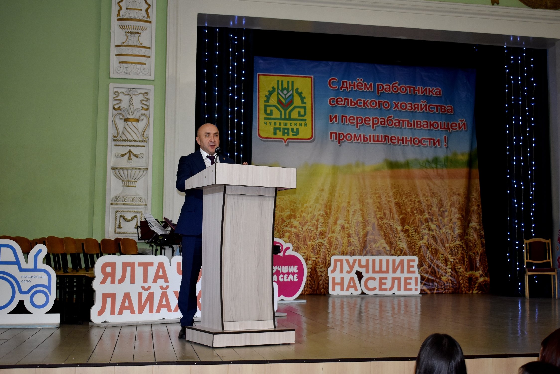 Поздравили с праздником профессорско-преподавательский состав, сотрудников и студентов вуза: заместитель Председателя Кабинета Министров Чувашской Республики – министр сельского хозяйства Чувашии Сергей Артамонов, представители Союза ветеранов агропромышленного комплекса Чувашской Республики Александр Самылкин, Василий Шадриков, Иван Аверьянов, ректор Чувашского ГАУ Андрей Макушев. Гости в своих поздравлениях отметили, что аграрный вуз благодаря профессорско-преподавательскому составу готовит специалистов, способных обеспечить динамичный рост агропромышленного комплекса региона, и выразили коллективу огромную благодарность за неустанный труд, творческий подход к порученному делу и пожелали дальнейших успехов. Праздничный концерт подарил коллектив Чувашской государственной академической симфонической капеллы под руководством художественного руководителя и главного дирижера, народного артиста Российской Федерации, заслуженного деятеля искусств Российской Федерации Мориса Яклашкина. На торжественном мероприятии чествовали преподавателей и сотрудников, отличившихся в профессиональной деятельности и общественной работе. Приказом Министерства сельского хозяйства Российской Федерации за многолетний добросовестный труд в системе агропромышленного комплекса БЛАГОДАРНОСТЬ МИНИСТЕРСТВА СЕЛЬСКОГО ХОЗЯЙСТВА РОССИЙСКОЙ ФЕДЕРАЦИИ объявлена ЕГОРОВУ Виталию Петровичу – доценту кафедры транспортно- технологических машин и комплексов. За вклад в развитие образования и науки в Чувашской Республике БЛАГОДАРНОСТЬ И ЧАСЫ ОТ ГЛАВЫ ЧУВАШСКОЙ РЕСПУБЛИКИ вручаются: ЕГОРОВОЙ Елене Юрьевне – начальнику учебно-методического управления, ЯТРУШЕВОЙ Елене Сергеевне – доценту кафедры биотехнологий и переработки сельскохозяйственной продукции. За многолетний добросовестный труд в системе агропромышленного комплекса ПОЧЕТНОЙ ГРАМОТОЙ МИНИСТЕРСТВА СЕЛЬСКОГО ХОЗЯЙСТВА ЧУВАШСКОЙ РЕСПУБЛИКИ награждены: ВЕДИНА Татьяна Анатольевна – маляр отдела эксплуатации зданий и сооружений административно - хозяйственного управления, ДОБРОХОТОВА Екатерина Станиславовна – начальник отдела планирования и организации учебного процесса учебно-методического управления. За вклад в развитие агропромышленного комплекса Чувашской Республики и активную благотворительную деятельность БЛАГОДАРНОСТЬ Министра сельского хозяйства Чувашской Республики объявлена коллективу Чувашского государственного аграрного университета. За добросовестный труд в системе агропромышленного комплекса Чувашской Республики БЛАГОДАРНОСТЬ Министра сельского хозяйства Чувашской Республики объявлена: ДАВЫДОВУ Владимиру Леонидовичу – заместителю начальника организационно-правового управления, ТОЛСТОВОЙ Татьяне Федоровне – юристу организационно-правового управления, ТЮМЕРОВУ Ивану Геннадьевичу – системному администратору отдела информационных технологий и полиграфии, ШАМБИНОЙ Татьяне Васильевне – заведующему общежитием № 6 административно-хозяйственного управления, ЯКУШЕВОЙ Анастасии Юрьевне – специалисту по работе с молодежью отдела молодёжной политики управления воспитательной и социальной работы. За плодотворное сотрудничество, внимательное и чуткое отношение к ветеранам агропромышленного комплекса Чувашской Республи