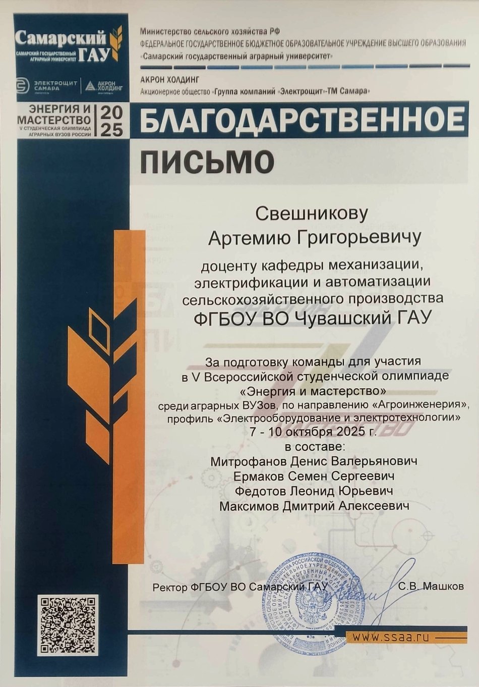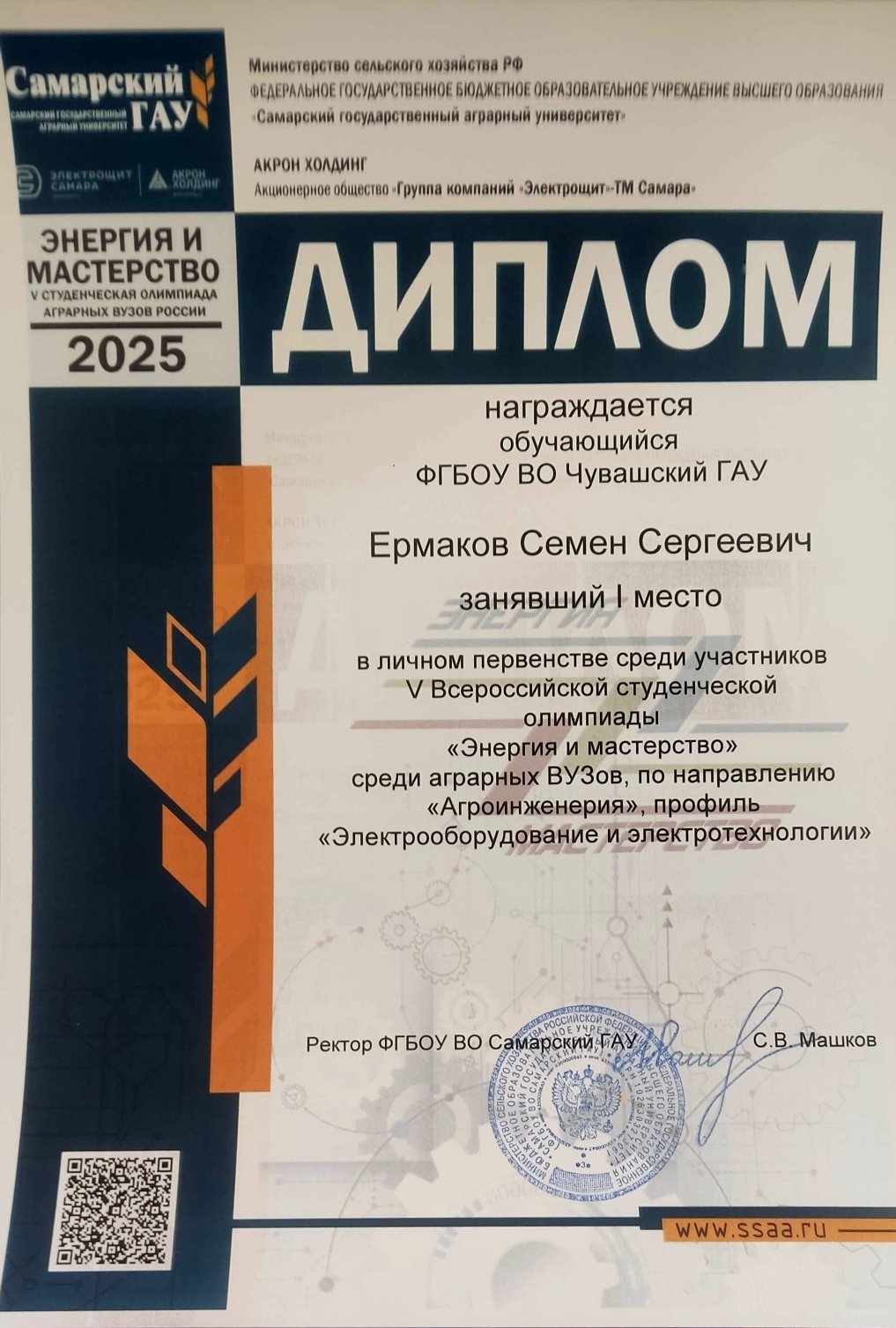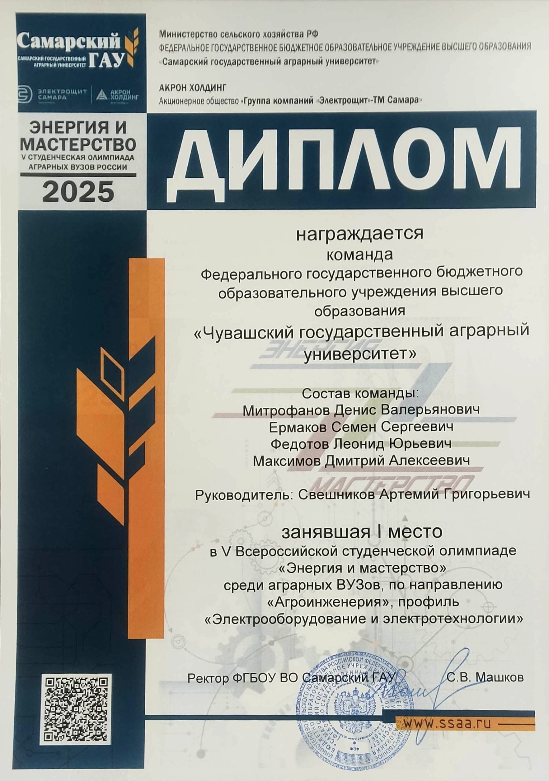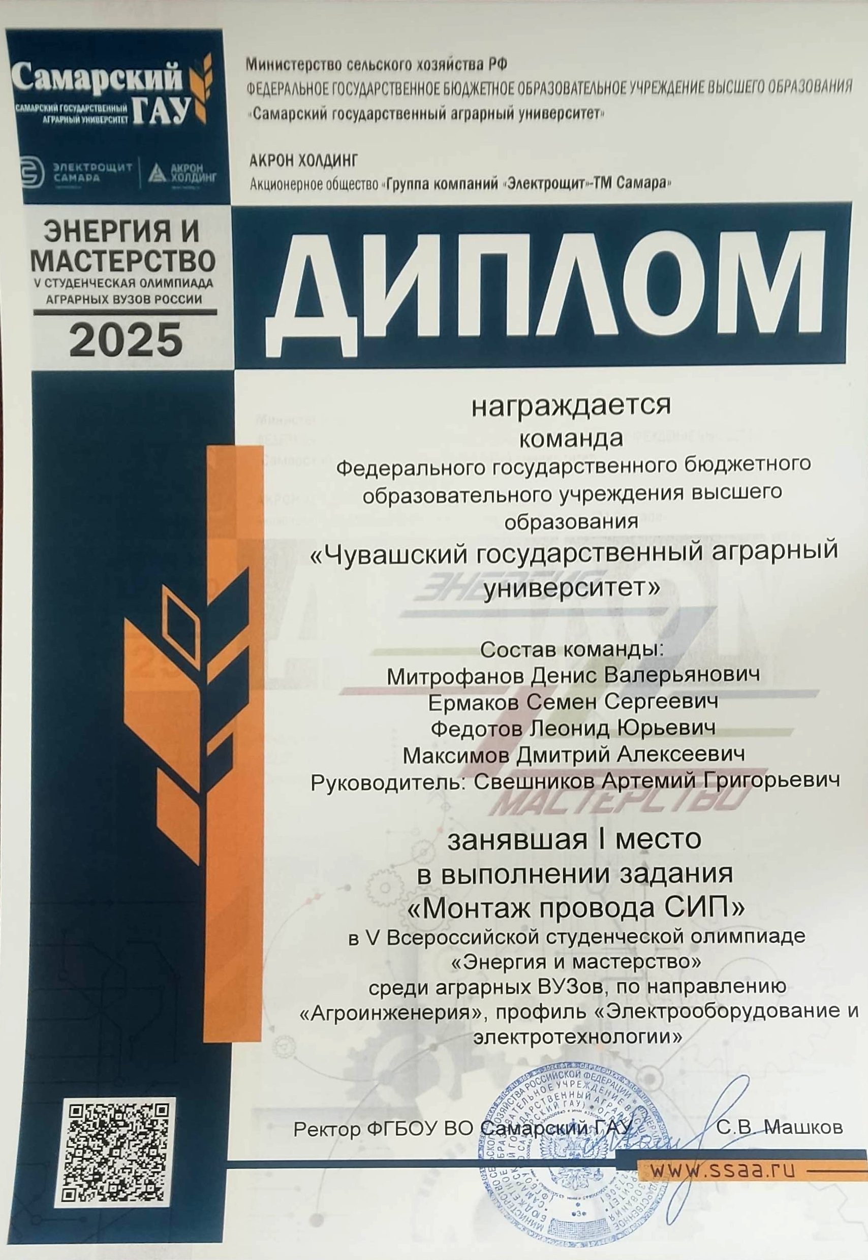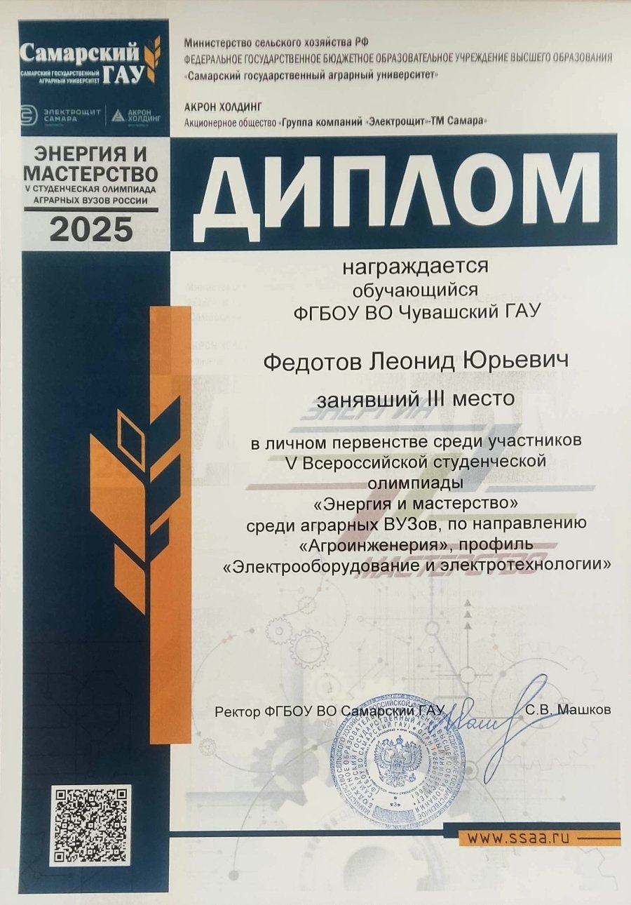 ![]() Поздравил студентов в своем сообществе в социальной сети ВКонтакте Глава Чувашии Олег Николаев и пожелал дальнейших успехов. «Энергия и мастерство» – это не просто название. Это суть того, что ежегодно собирает молодых людей на инженерном факультете Самарского ГАУ. Энергия смелости, амбиций, знаний, умноженная на высочайшее профессиональное мастерство. На протяжении четырех дней участники демонстрируют теоретические знания по электротехническим дисциплинам и практические навыки в монтаже электрооборудования, показывая высокий уровень подготовки и мастерства. Благодаря тесному сотрудничеству стало доброй традицией проводить олимпиаду при поддержке партнера – Акционерного общества «ГК Электрощит-Самара». Всероссийская студенческая олимпиада «Энергия и мастерство» проводится в целях выявления качества подготовки выпускаемых специалистов, дальнейшего совершенствования мастерства студентов, закрепления и углубления знаний и умений, полученных в процессе теоретического и практического обучения. Олимпиада включает в себя 2 этапа: теоретический и практический. Тестовые задания и конкурсные задачи теоретического этапа включают вопросы дисциплин «История электротехники и электроэнергетики», «Электротехника», «Эксплуатация электрооборудования», «Электрические машины», «Электробезопасность», «Светотехника», «Электроснабжение». Практические задания базируются на дисциплине «Монтаж электрооборудования и средств автоматизации». Индивидуальные задания: «Монтаж осветительной установки», «Сборка вводно-распределительного квартирного щита», «Сборка электрической схемы поточной линии», «Сборка электрической схемы АВР», а также командное задание: «Монтаж провода СИП». Призовые места в командном зачете распределились следующим образом: I место – команда Самарского государственного аграрного университета (абсолютный победитель) и Чувашского государственного аграрного университета. II место – команда Саратовского государственного университета генетики, биотехнологии и инженерии имени Н.И. Вавилова. III место – команда Башкирского государственного аграрного университета. В составе команды Чувашского ГАУ выступили студенты, обучающиеся по направлению подготовки «Агроинженерия» (направленность «Электрооборудование и электротехнологии»), Денис Митрофанов, Семен Ермаков, Леонид Федотов, Дмитрий Максимов. Руководитель: доцент кафедры механизации, электрификации и автоматизации сельскохозяйственного производства Артемий Свешников. Команда Чувашского ГАУ была лучшей при выполнении практического задания «Монтаж провода СИП». В личном первенстве среди участников отличились Семен Ермаков (1 место) и Леонид Федотов (3 место). Декан инженерного факультета Чувашского ГАУ Николай Пушкаренко отметил: «Наши студенты уже третий год подряд оказываются лучшими и сильнейшими на этой олимпиаде. Это свидетельствует о высоком уровне подготовки. Мы гордимся их достижениями и уверены, что они смогут подтвердить свой статус и в будущем». ![]() ![]() ![]() ![]() ![]() ![]() ![]() |