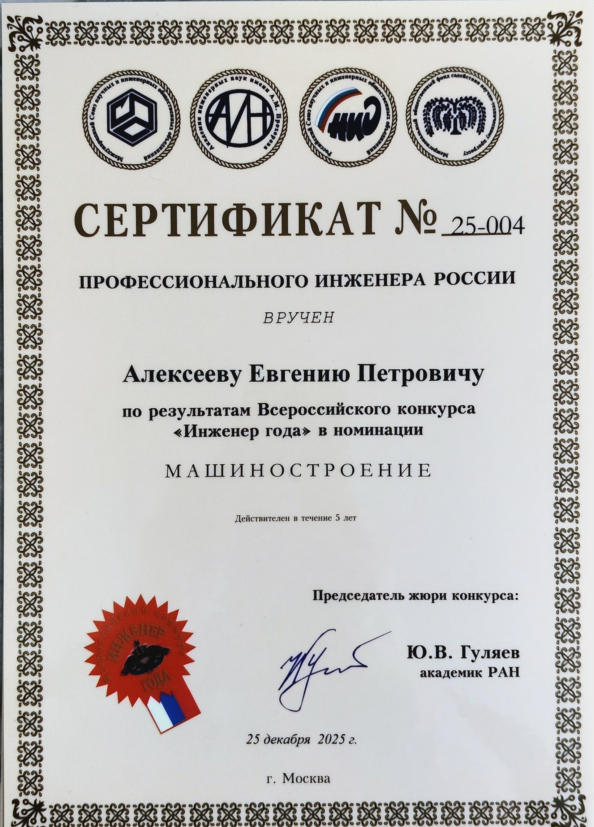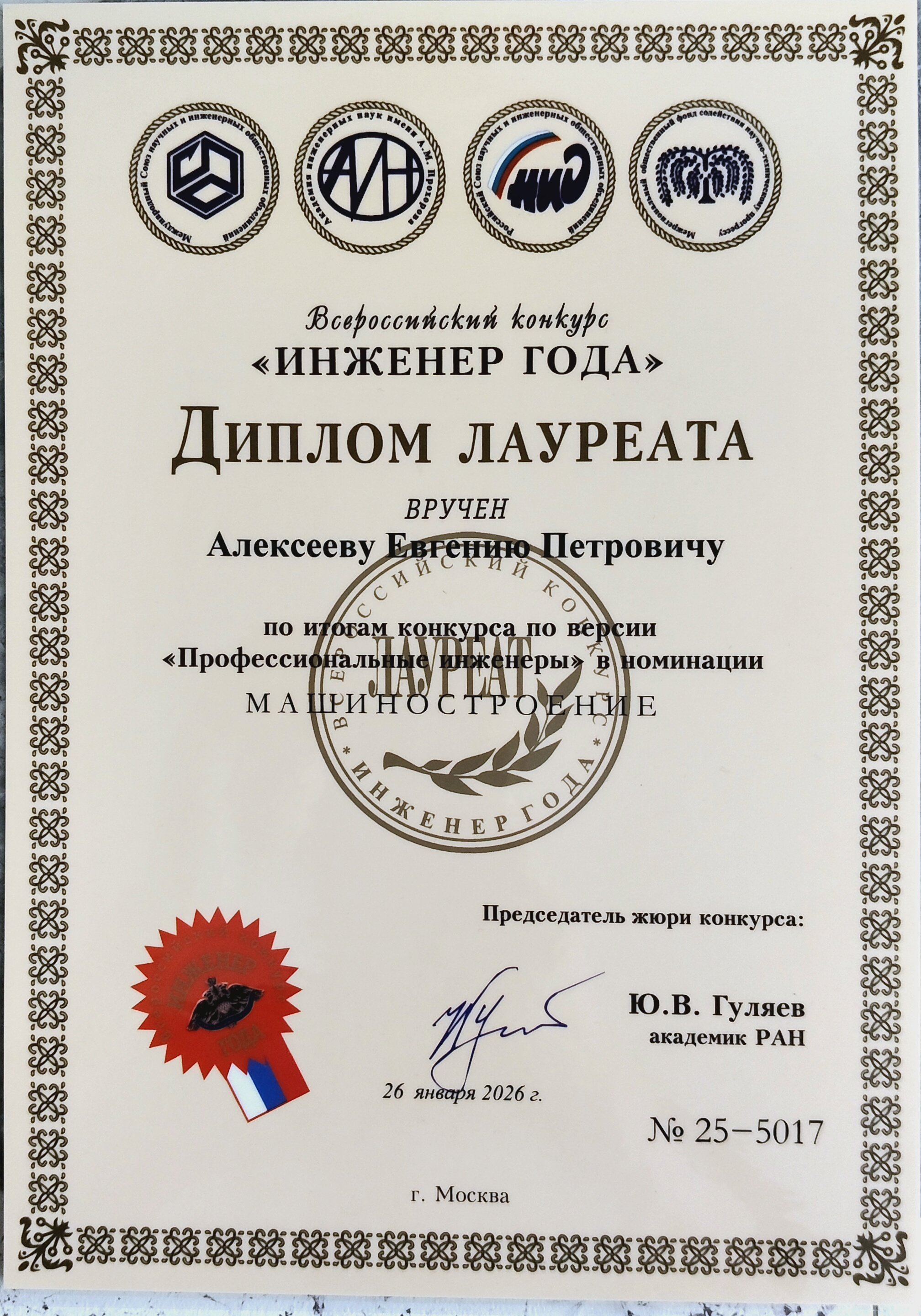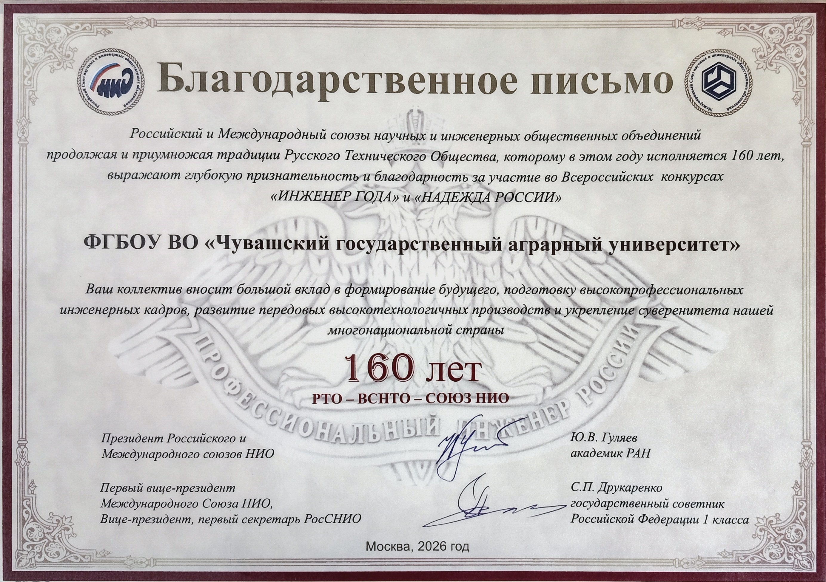 Конкурс является крупнейшим социальным проектом, реализуемым в России с целью выявления и распространения передового опыта и достижений инженерных кадров, лучших в своей сфере деятельности. Конкурс традиционно проводится в двух версиях: Инженерное искусство молодых» - для участвующих в конкурсе молодых специалистов в возрасте до 35 лет включительно; «Профессиональные инженеры» - для участников конкурса - специалистов, имеющих стаж работы, в том числе на инженерных должностях, не менее 5 лет. В числе лауреатов направления «Профессиональные инженеры» – два представителя Чувашского государственного аграрного университета. Алексеев Евгений Петрович – доцент кафедры «Транспортно-технологические машины и комплексы» инженерного факультета Чувашского ГАУ, кандидат технических наук, автор 150 опубликованных научных статей в различных журналах и сборниках, в том числе в 25 издании, рекомендованных ВАК Министерства науки и высшего образования РФ, имеет 12 патентов РФ на изобретения и 10 свидетельств о регистрации программы для ЭВМ. Внес существенный вклад в разработку технологий и технических средств для управления продукционным процессом в растениеводстве. Материалы его исследований направлены на совершенствование конструкции рабочих органов машин для основной обработки почвы, посева и внесения удобрений. Внедрение предлагаемых решений позволяют в своей совокупности достичь следующих положительных эффектов, таких как повышение урожайности и производительности, а также снижение трудовых и энергетических затрат. Гаврилов Владислав Николаевич - заведующий кафедрой технического сервиса инженерного факультета Чувашского ГАУ, кандидат сельскохозяйственных наук, доцент, автор 184 опубликованных научных статей в различных журналах и сборниках, в том числе в 14 изданиях, рекомендованных ВАК Министерства образования и науки РФ, имеет 6 патентов на изобретения. Внес существенный вклад в разработку ресурсосберегающих технологий и технических средств для возделывания сельскохозяйственных культур. Материалы его исследований направлены на совершенствование конструкции машин для посадки и внесения жидких органоминеральных удобрений с дозирующими и распределяющими рабочими органами. Внедрение предлагаемых решений позволяют в своей совокупности достичь следующих положительных эффектов, таких как увеличение производительности машинотракторных агрегатов и повышения урожайности, а также снижение трудовых и энергетических затрат. Ученые Чувашского ГАУ отличились в номинациях «Агроинженерия» и «Машиностроение». Информацию о наших победителях можно посмотреть по ссылкам: https://rusea.info/eoaywinners/20488 https://rusea.info/eoaywinners/20361 Российский и Международный союзы научных и инженерных общественных объединений выражают глубокую признательность и благодарность за участие во Всероссийских конкурсах «Инженер года» и «Надежда России» коллективу Чувашского государственного аграрного университета за большой вклад в формирование будущего, подготовку высокопрофессиональных инженерных кадров, развитие передовых высокотехнологичных производств и укрепление суверенитета нашей многонациональной страны. |