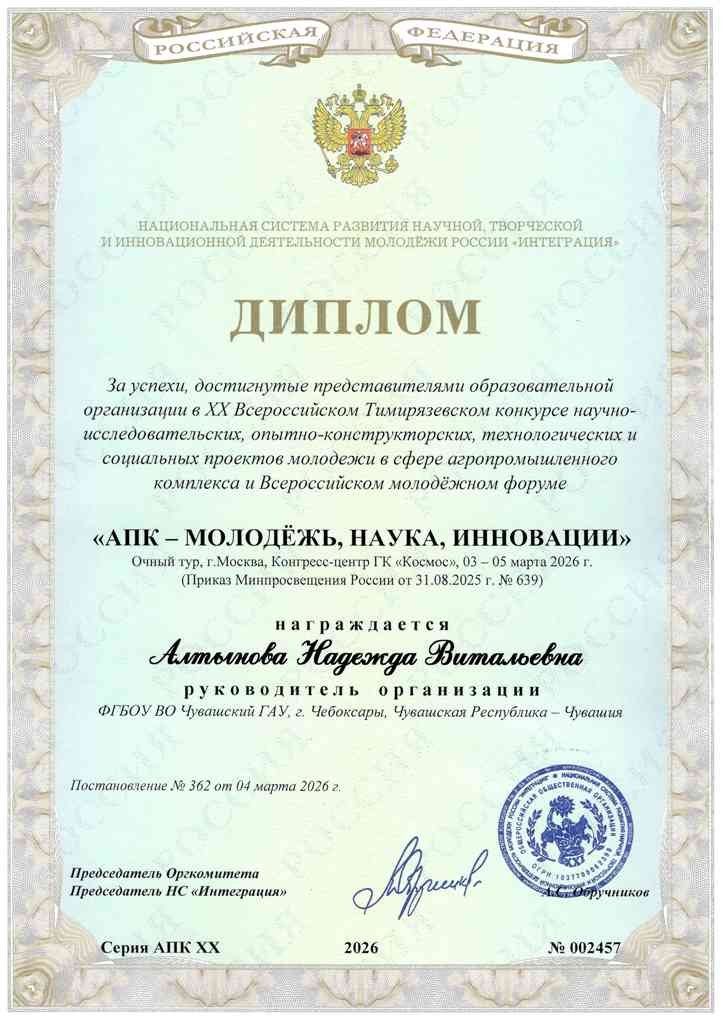 23 апреля 2026 - Международные конкурсы «Брат на смену Брату: традиция продолжается!» и «Герои Хасан… 21 апреля 2026 - ВСЕРОССИЙСКАЯ ПРЕМИЯ «МОЛОДОЙ ПРЕДПРИНИМАТЕЛЬ РОССИИ» 2026! 08 апреля 2026 - Ассоциация образовательных учреждений АПК и рыболовства и Чувашский государственный… 26 февраля 2026 - Приглашаем на курсы по кинологии! 16 февраля 2026 - Конкурс проектных работ по развитию агробизнеса «Переход от идеи к рынку: коммерциа… 22 декабря 2025 - Чувашский ГАУ открыл канал в МАХ! 12 декабря 2025 - О мерах соцподдержки участников СВО и членов их семей 08 декабря 2025 - Памятка от Чувашской транспортной прокуратуры Молодой ученый Чувашского ГАУ – победитель Всероссийского конкурса «АПК – МОЛОДЕЖЬ, НАУКА, ИННОВАЦИИ»!