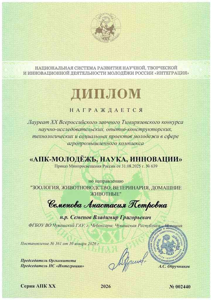 Конкурс состоял из трех туров: 1. Местный (Региональный) отборочный этап, который проводился в образовательных организациях субъектов Российской Федерации; 2. Всероссийский заочный отборочный этап, в рамках которого проходило изучение методических рекомендаций и подготовка конкурсной работы, оформление тезисов работы и подача заявки для участия в конкурсе. Именно по результатам этого тура Анастасия Семенова стала лауреатом ХХ Всероссийского заочного Тимирязевского конкурса научно-исследовательских, опытно-конструкторских, технологических и социальных проектов молодежи в сфере агропромышленного комплекса «АПК – МОЛОДЕЖЬ, НАУКА, ИННОВАЦИИ», что позволило ей принять участие в третьем заключительном этапе. 3. Всероссийский заключительный очный этап (молодежный форум) проходил в Конгресс-центре ГК «Космос» в г. Москва и заключался в защите работ перед экспертным советом и вручении сборников тезисов и наградной продукции. По итогам III тура Анастасия Семенова стала победителем и была удостоена Диплома I степени и награждена медалью «За научную работу» II степени. 5 марта на торжественном закрытии Всероссийского мероприятия были объявлены победители конкурса. Им были вручены специальные дипломы и знаки отличия. «Без поддержки ректората, а главное без наставлений и рекомендаций научного руководителя Владимира Семенова, доктора биологических наук, профессора, заслуженного деятеля науки Российской Федерации, мне бы было сложно выйти в финал победителем. Всем огромное спасибо!», отмечает Анастасия Семенова. По итогам конкурса был опубликован сборник на 900 страницах. Кроме того, информация о победителях и призёрах войдет в государственный информационный ресурс о лицах, проявивших выдающиеся способности (ГИР), а статьи победителей и призёров опубликуются в международном журнале «Научные высказывания». Поздравляем Анастасию Семенову с победой и желаем молодому ученому и ее научному руководителю удачи и успехов в дальнейшей научно-исследовательской деятельности! Справочно Всероссийский Тимирязевский конкурс «АПК – МОЛОДЕЖЬ, НАУКА, ИННОВАЦИИ» – это масштабный конкурс для школьников, студентов и научных работников (14–35 лет), которые занимаются научной или исследовательской деятельностью. Национальная система «Интеграция» предлагает участникам создать проект со своими идеями, разработками или исследованиями и представить его для оценки перед экспертным жюри. Основной целью проведения конкурса является формирование у детей и молодежи интереса к научной, творческой и иной созидательной деятельности, распространение и популяризация научных знаний в сфере агропромышленного комплекса, подведение итогов самостоятельной научной, учебно-исследовательской и иной творческой работы в этой сфере. |